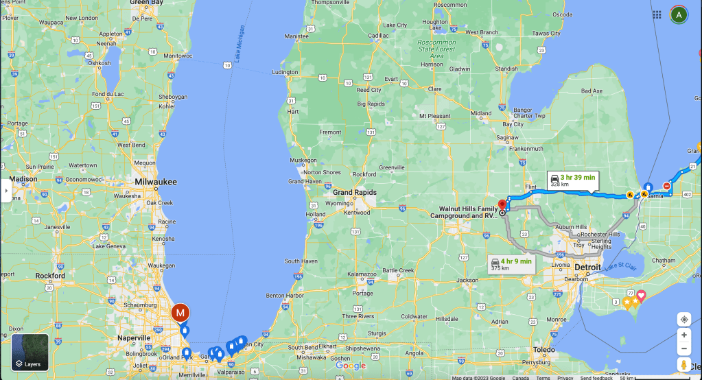 From there on things were uneventful until we hit the Sarnia border crossing across the Bluewater bridge. Although the website said a 10 min wait, with it being the middle of a long weekend in Canada the border crossing traffic was actually backed up over an hour and a half! An hour and a half stuck in traffic with 3 kids and no way to use the bathrooms sounds like a parental nightmare, but thankfully we had made a pit stop about 30 min before and our kids took things in stride. We survived the ordeal and after some simple questions and a bit of surprised that we were taking over a month to get to Calgary, we made our way into Michigan.