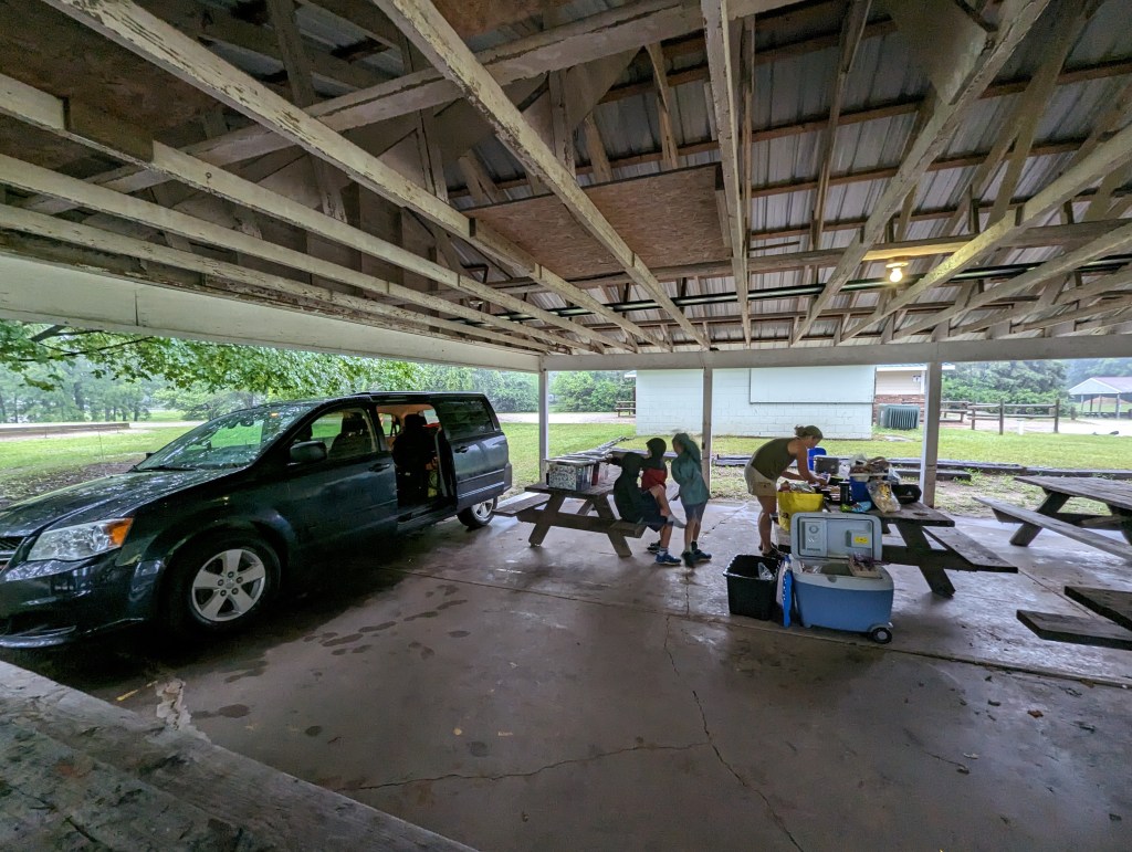 We pulled up next to a picnic shelter and got dinner going of cold sandwiches with hot chocolate. While I cleaned up, Katherine went to pick a site that wasn’t submerged under water and got the tent set up in the rain with Mia. With no where else to go in the rain, the boys were getting into all kinds of trouble under the picnic shelter, but having the picnic shelter was definitely appreciated.