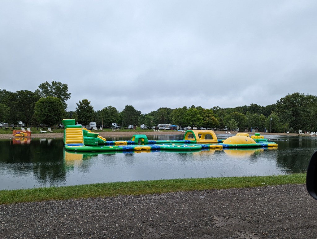 We had pre-purchased and activated our data SIM cards for the US, however, we didn’t realize we had to change APN settings on our phones. This meant we had no cell coverage but we weren’t exactly sure why it wasn’t working (we initially thought we hadn’t activated them). We didn’t think too much of it as we already had a campground booked and just had to arrive. As we got closer to our campground it started to pour rain. With all the delays, our 3.5 hour drive became more of a 6 hour event and we didn’t arrive until 7:30PM, by which time the campground office was closed! We had an access code to open the gate, however, we didn’t know which site we were supposed to be on. There was a phone number to call on the door, but with no working US SIM card, no data, and no WIFI, we decided since it was raining with a bunch of empty sites we would just pick one. It was a bit stressful after a long day to try to figure out all of this at the end. Adding insult to injury, the specific reason we had paid a premium and picked the campground was for the water obstacle course on the campground lake. This turned out to only operates on the weekend, which was not advertised on their web site what-so-ever. Not only that but there were signs stating “kids will be banned from the campground for life” if they were caught going on them. Needless to say this resulted in some meltdowns but it was pouring rain anyway and getting late that we decided we just needed to get dinner going and our tent set up and call it a day.