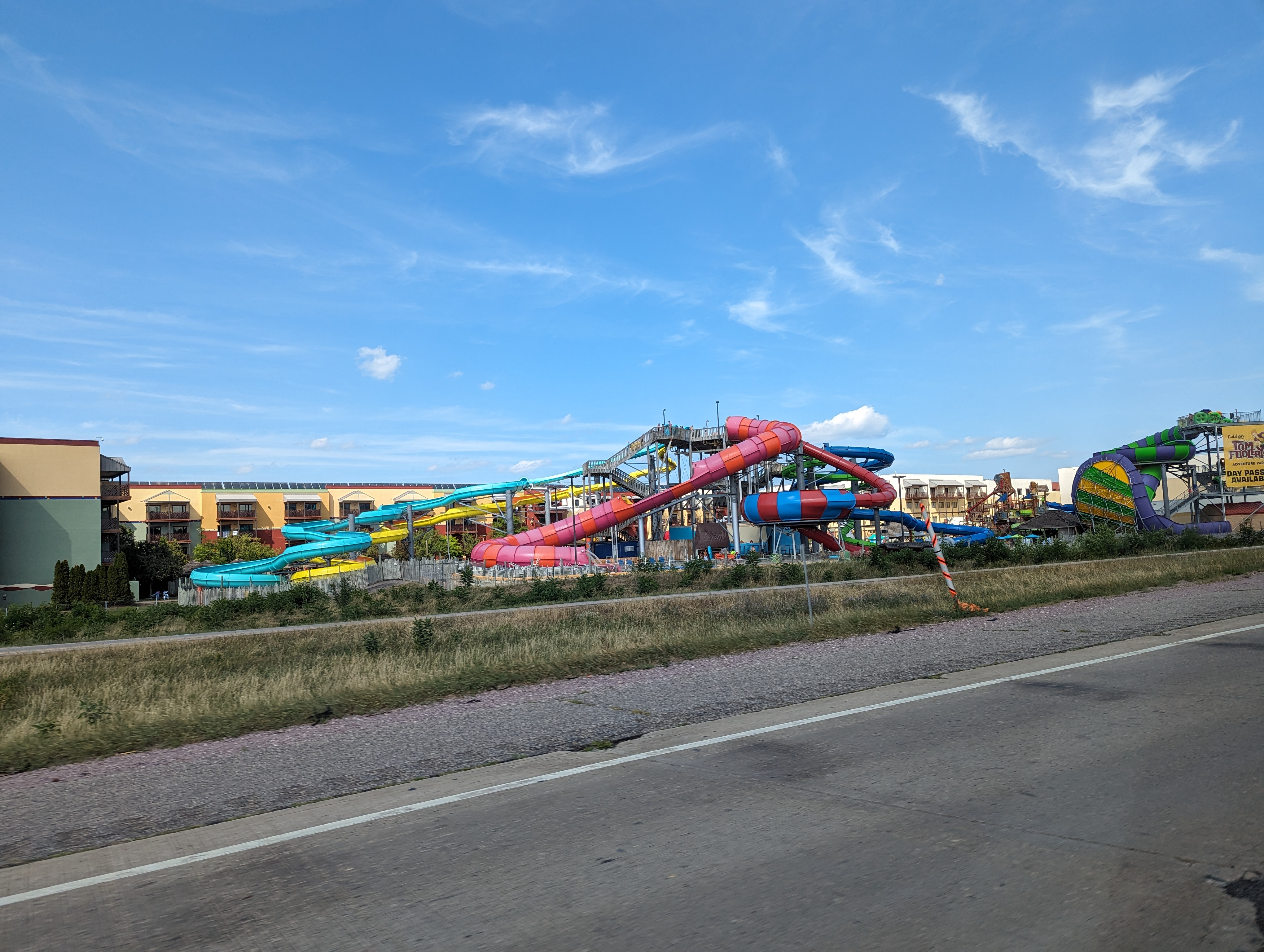 The drive was very straight forward on the I-90 interstate, but it was neat to see the scenery change to hills as we got closer to our destination. The interstate was a four lane divided highway and had minimal traffic. We passed Wisconsin Dell, which had so many massive water park and water park resort hotels it was incredible. The kids were a little sad we were not stopping there. We turned off the highway after the long drive to head towards our Blue Bird campground. The backroads were windy and it took us into a valley. The campground was basically at the end of the road in the valley.