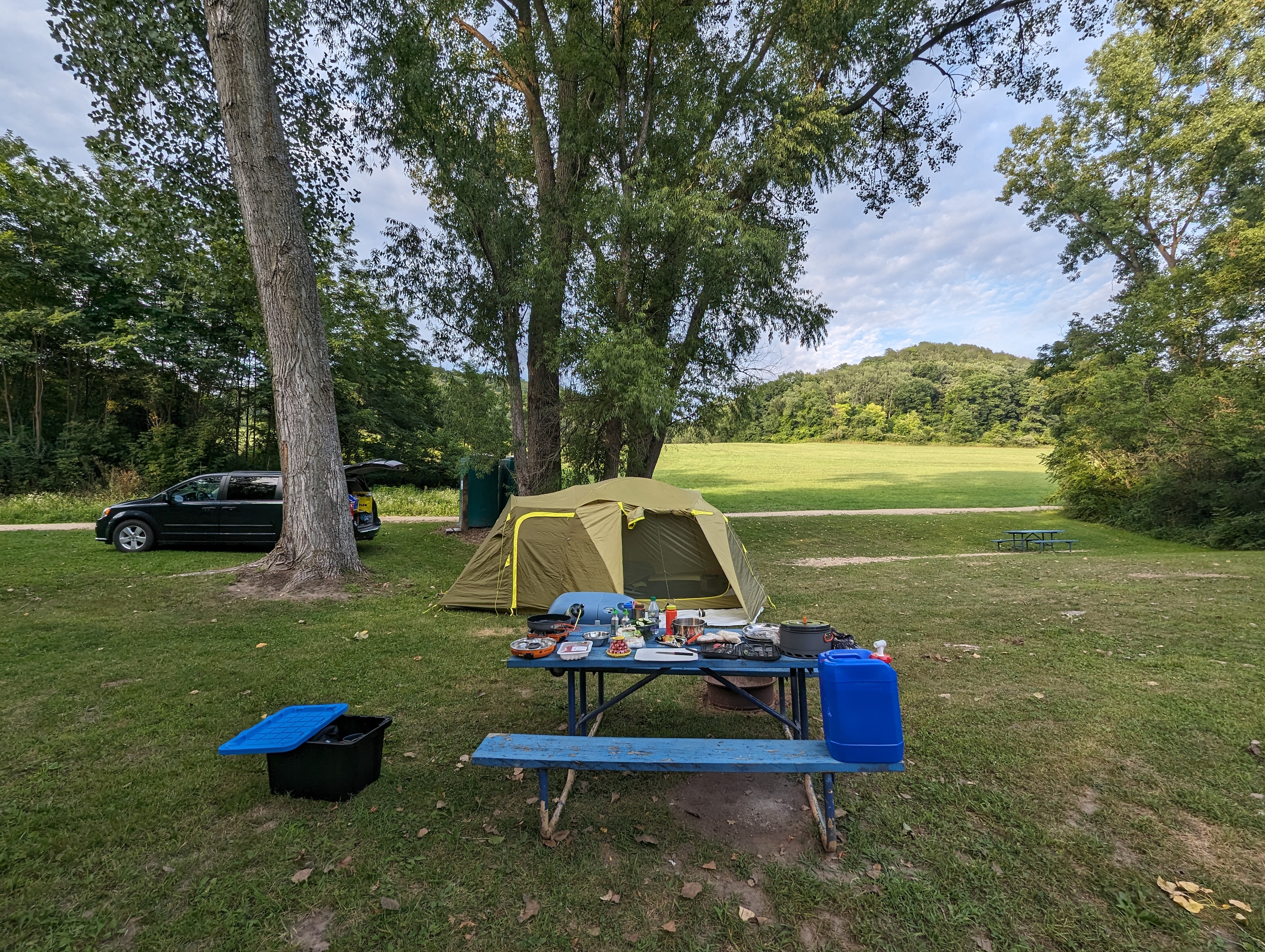 The campground had a full service bar, and everyone was super friendly inside (you had to go to the bar to check in). Of all the campgrounds I have been to this was definitely the first one with an actual bar building. They even had good alt rock music. I was however clearly the stranger from out of town with everyone looking at me as I entered the bar. They suggested I sit down and grab a drink while I wait to get checked in but I mentioned the kids were in the van so I couldn’t. They gave me some tips on the good sites to pick based on morning or afternoon sun and we went out to pick our site. There were many RVs but there were mostly empty sites along the creek for tent camping. We picked the suggested site right beside the porta-potties and water tap. It had a nice view of the hills behind the campground. We really needed to do some laundry so we got some quarters from the bar.