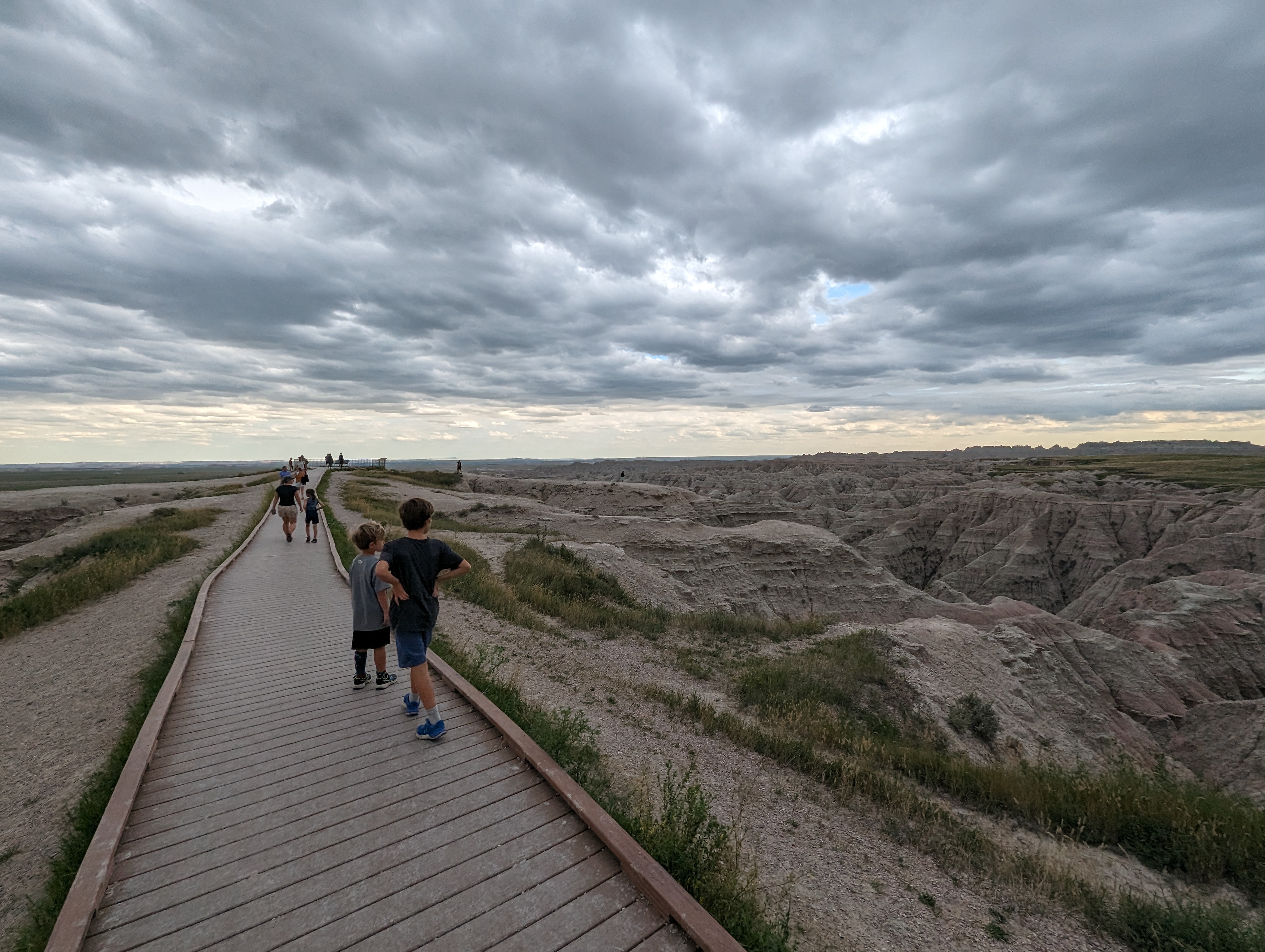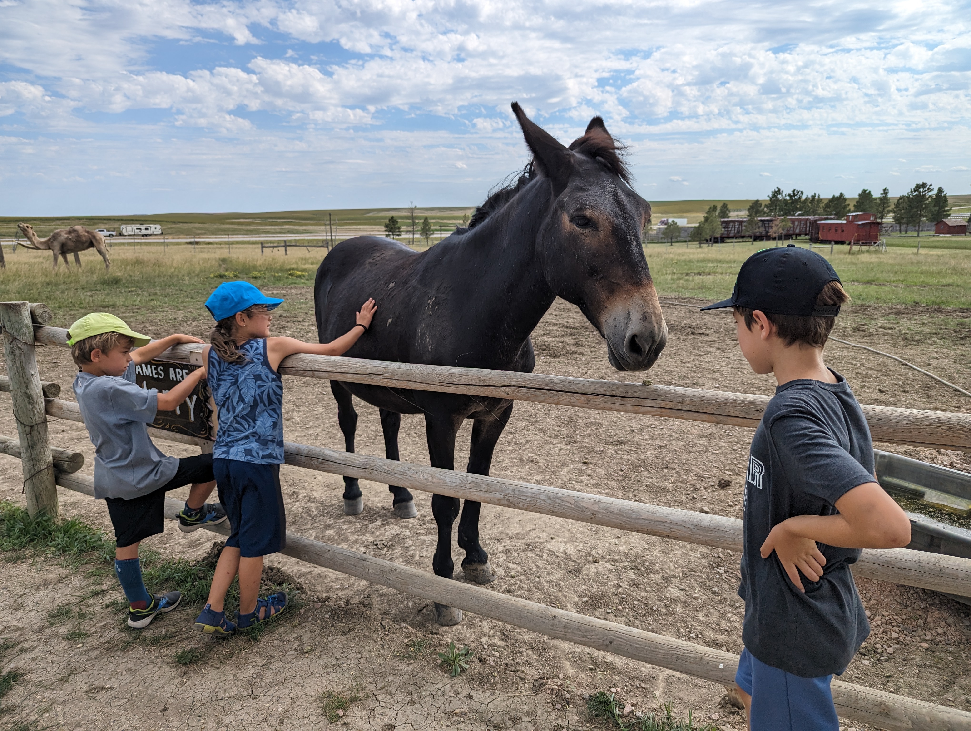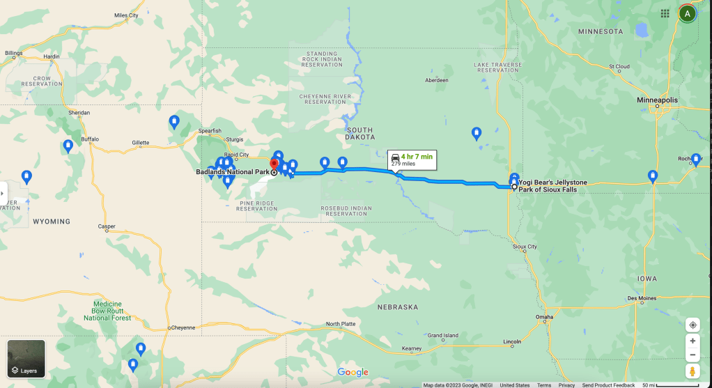 We woke up to the sound of trucks driving down the I-90 and sun beginning to hit our tent. It was going to be another very hot day. We had a quick breakfast of eggs and cereal. While Katherine cleaned up, packed up our tent, and had the kids burn off some energy, I headed down the road into Sioux Falls for supplies and groceries for the next few days as we head into the Badlands. We needed hats for the kids who had already lost a couple hats, broom to sweep out the tent that was starting to get sandy, more propane bottles, some headphones for the kids, and replacement shower sandals for Mia. The Walmart was a super centre and was incredible large, and it took a while to get everything we needed.
