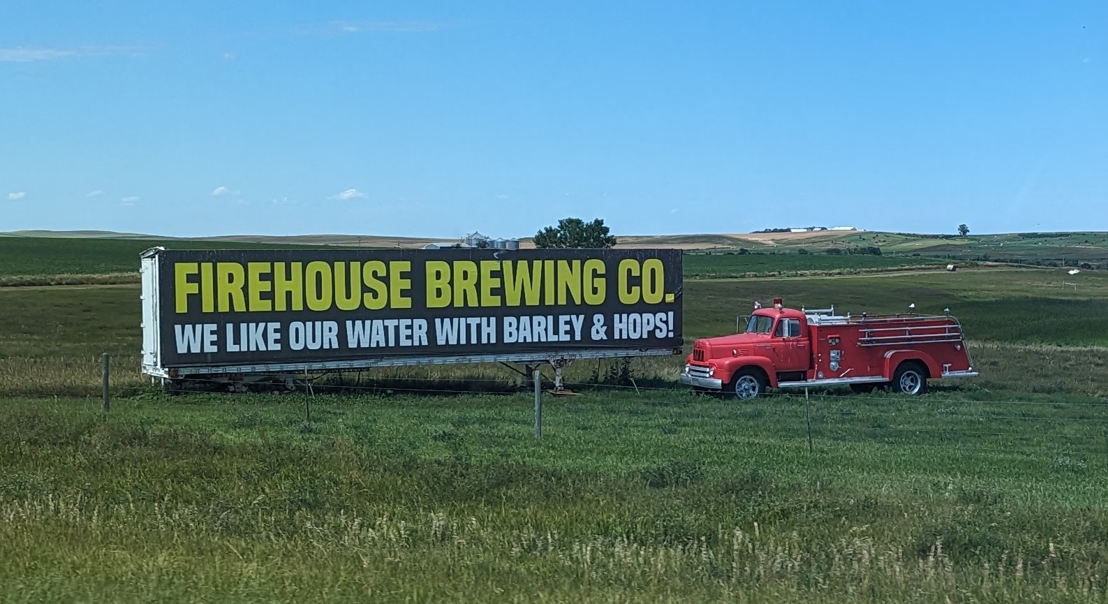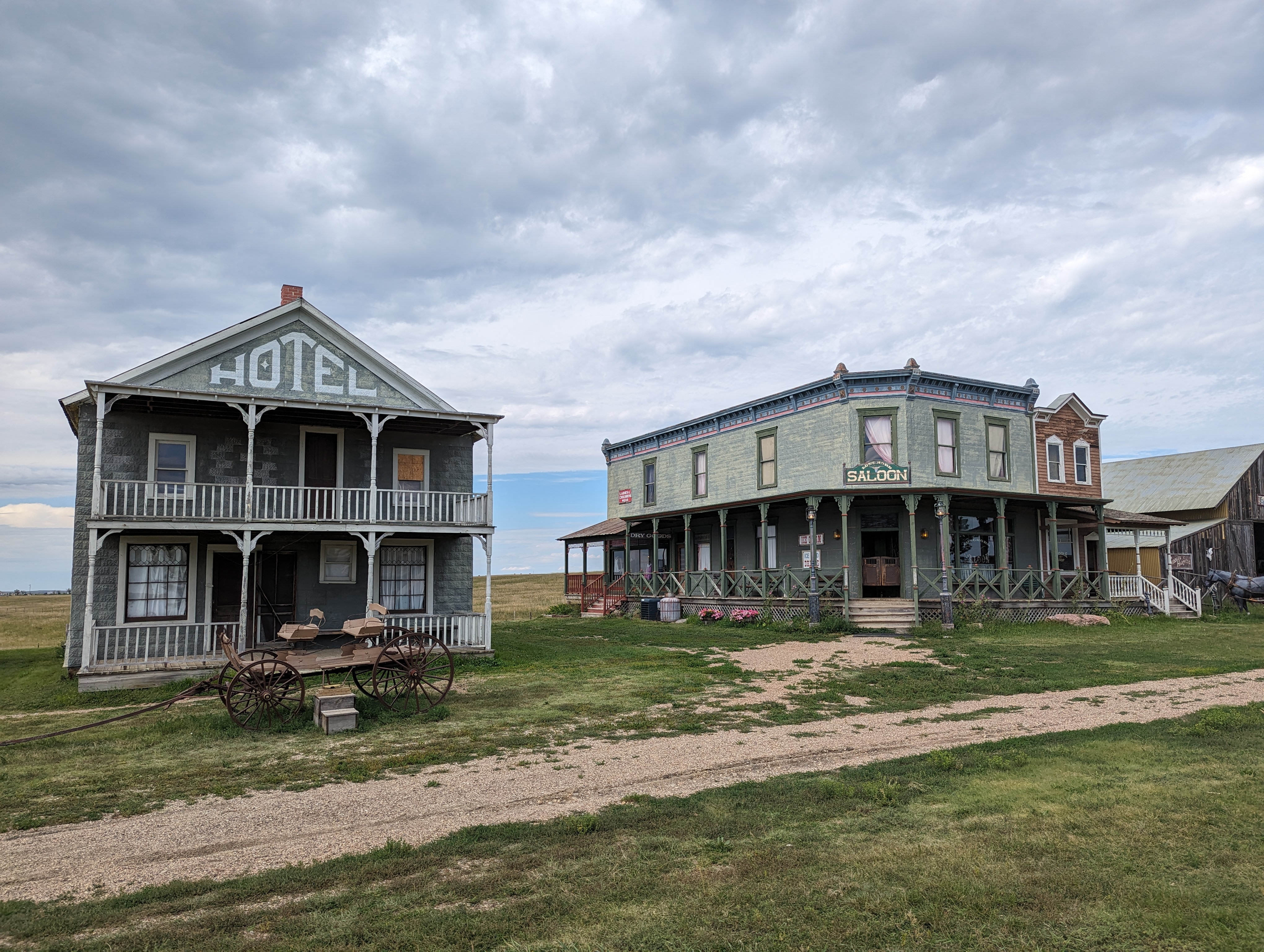The drive was very easy, a flat and straight divided highway most of the way. We started to climb on the elevation and were now at around 1300ft. The speed limit then increased from 70 miles/hr to 80 miles/hr. That’s around 125km/hr! Billboards are extremely effective and popular along this stretch of the highway as there is not much else to see in the flat plains. One brewery had an actual vintage firetruck parked at their bill boards for what was probably several hundred kilometres. There must have been at least 20 or more of these firetrucks along the side of the highway. We made good time despite the late start, and after 2.5 hours or so we stopped at a rest stop for a bathroom break and some food. It was hot outside, and the sun was very strong. The Badlands are typically very dry and do not get a lot of rainfall during the year. Katherine and I were even discussing how nice it was going to be to not have to worry about camping in the rain on the drive. However the sky was starting to look ominous in the direction we were driving. Another 45 min or so and we arrived at the town of 1880 (which was also advertise through bill boards for several hundred kilometres).