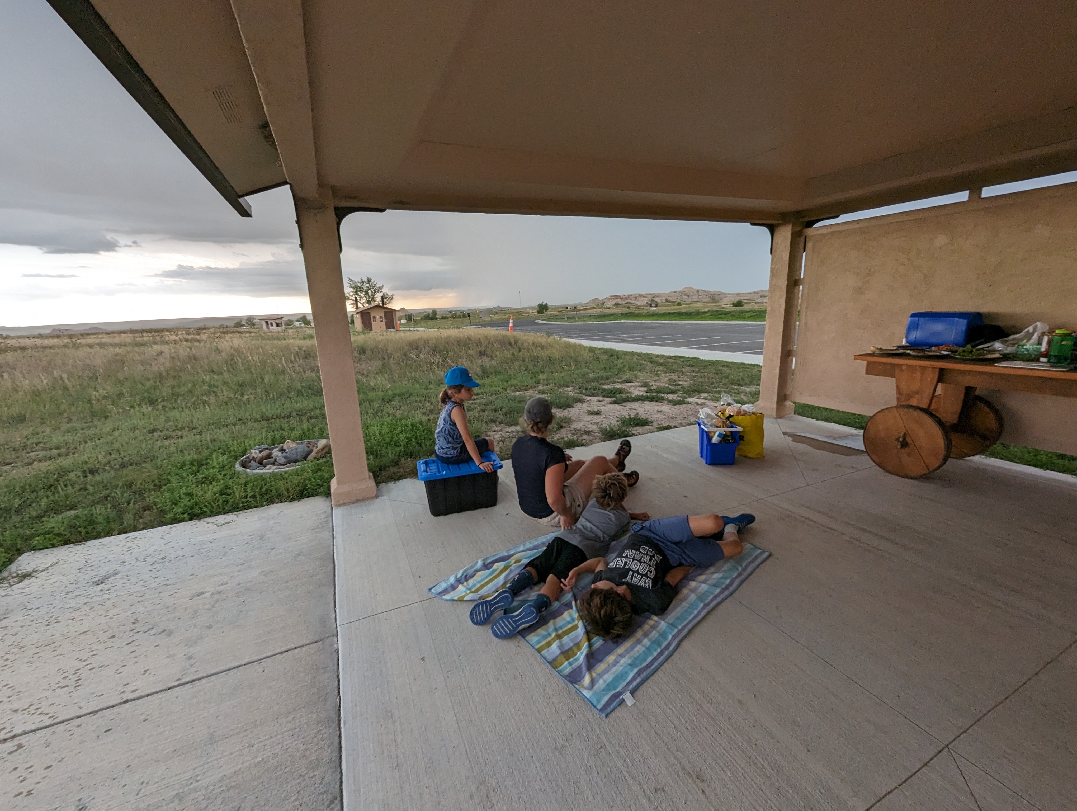 The campground was very exposed with almost no trees, and had no picnic shelter (only individual sun shade for each picnic tables on each site). We saw what looked like a picnic shelter just outside the campground on our way in and decided to head there to cook dinner and be sheltered from what we expected would be a short lived thunderstorm (as they usually are).