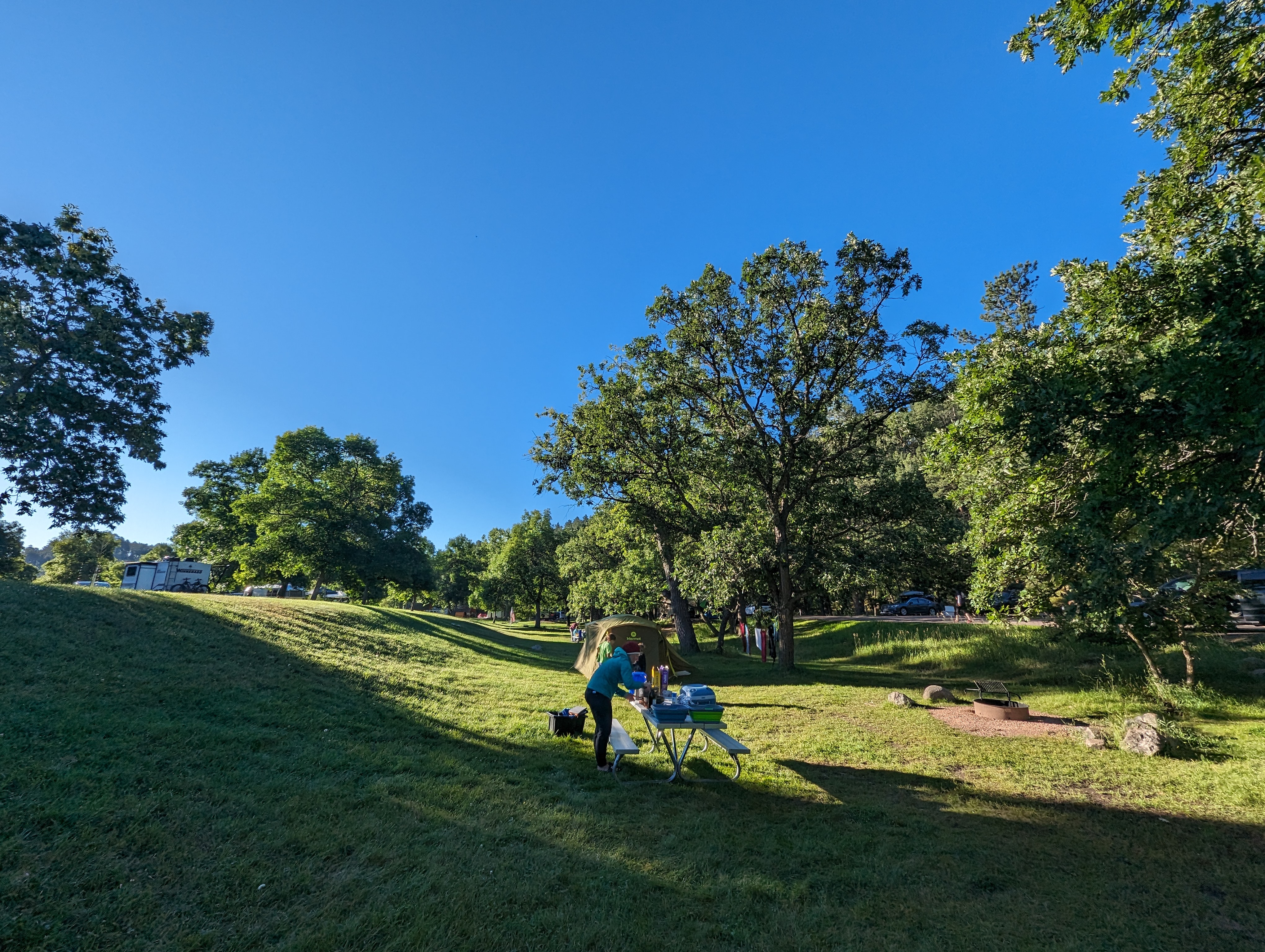 The highway went through some very isolated patches. We passed by isolated refineries and coal plants. We did go through a larger community of Gilette that appears to have very nice schools and school playgrounds. Near the end of our drive we could see the mountains emerge in the distance. We went through the town of Buffalo and then started to climb into the foothills. We went up about 2000ft in elevation very quickly. We just kept climbing and climbing for a long time and eventually reached 9666 ft to get through the Powder River Pass. We had no idea this was how high the mountain range was going to be. The temperature was 34 degrees C when we started the climb, and had dropped to 21C at the pass. We eventually arrived to our Big Horn Lakeview campground. RVs were higher on the hill by the highway and tents were by the lake. There were only about 20 sites in total and we just went to our site that had a reserve sign on it. We met people from Ontario who happened to be camping just a couple sites away from us. The sites were nice and large and everyone had to walk a short distance in from the parking lot. There were no showers but the pit toilets were very well maintained. It was a very nice campground. The people behind us had 6 or 7 kids, and 4 tents and a screen tent set up with a full passenger van. There were several empty sites and everyone was very quiet in the campground.