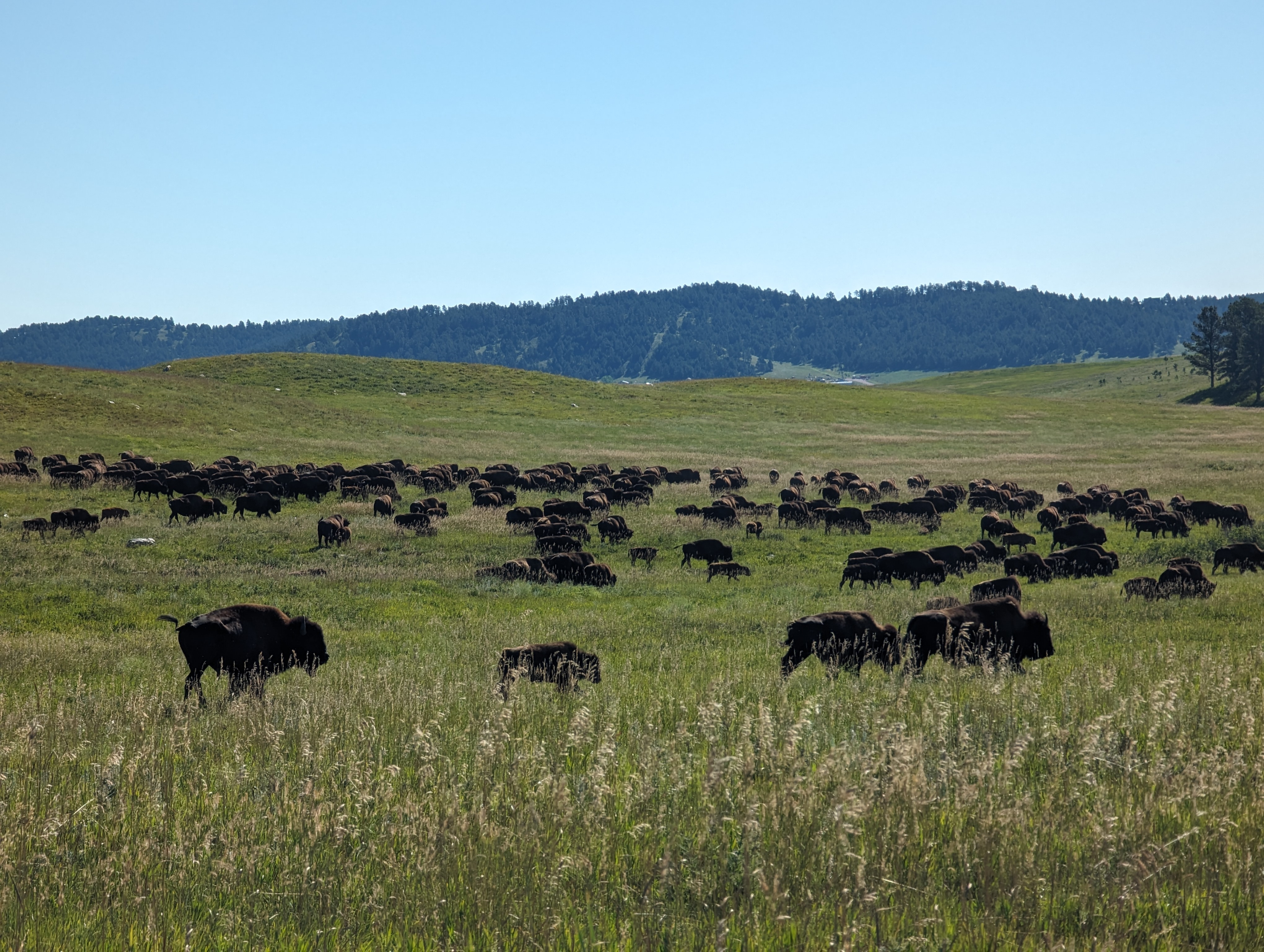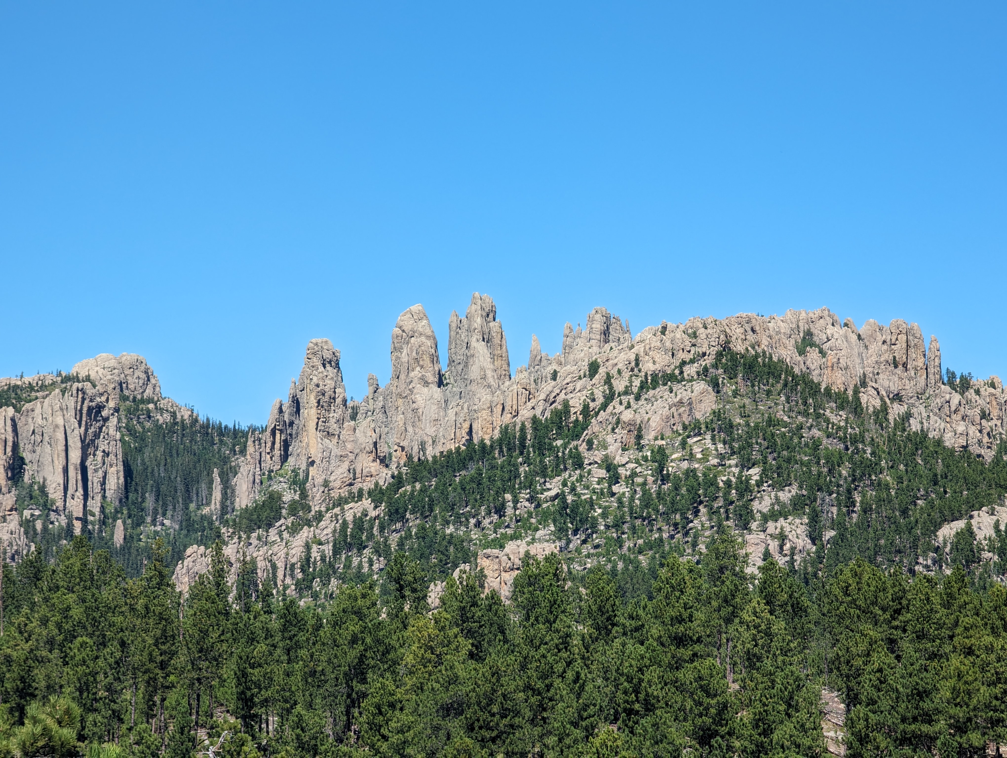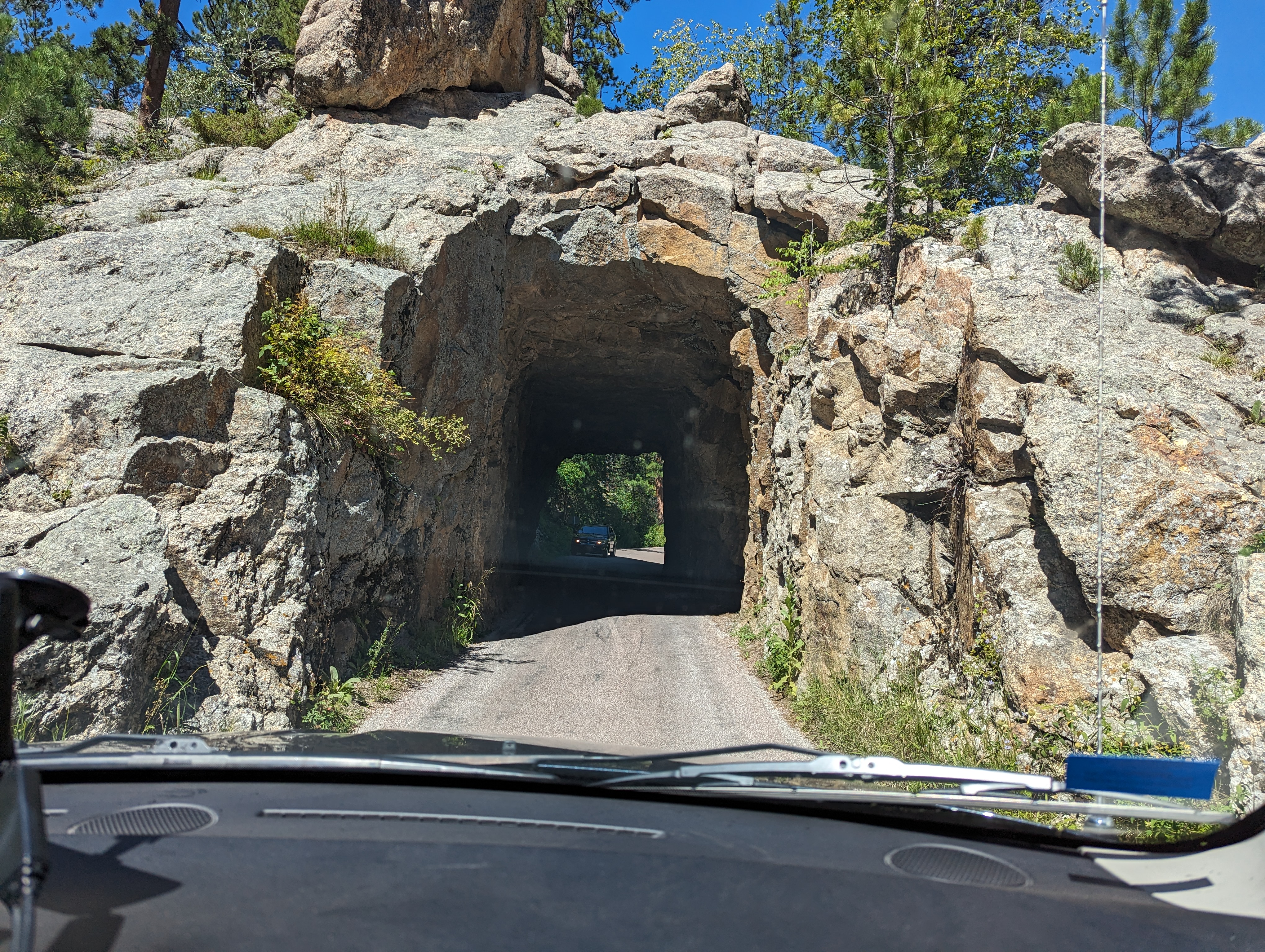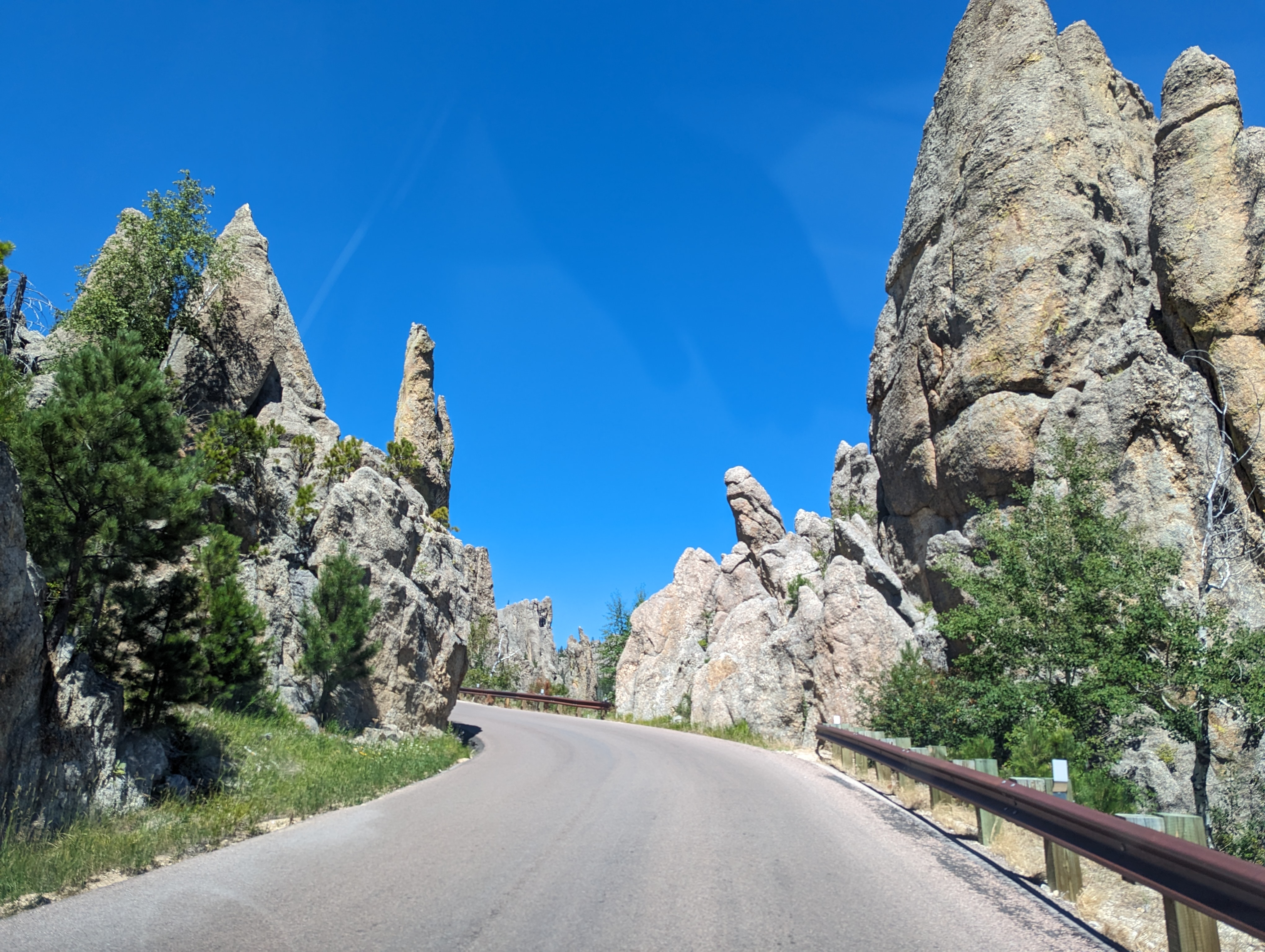 We needed to keep going so we got back in the van and headed towards the needles highway. The road was extremely windy and narrow in many places. We passed a touring cyclist, and agreed how amazing of a bike route it would be early in the morning when there would be little to no traffic. We were driving through a forest of tall pines, and then reached near the top, where the scenery became very impressive of towering rock that looked like giant fingers. We drove through a couple impressive small tunnels along the route. The route didn’t seem like much initially but became incredible near the top, and it was amazing they had managed to put a road through it.
