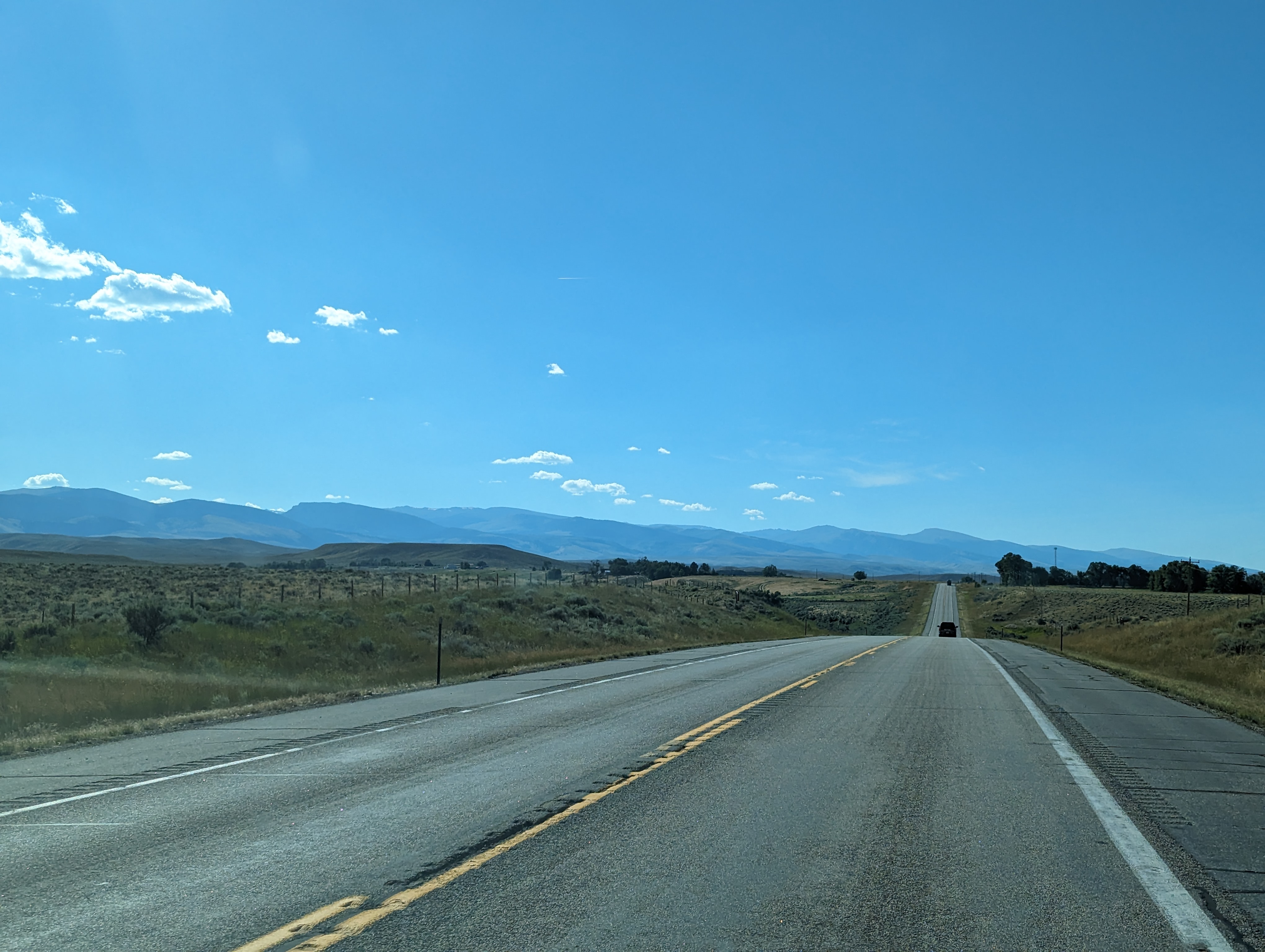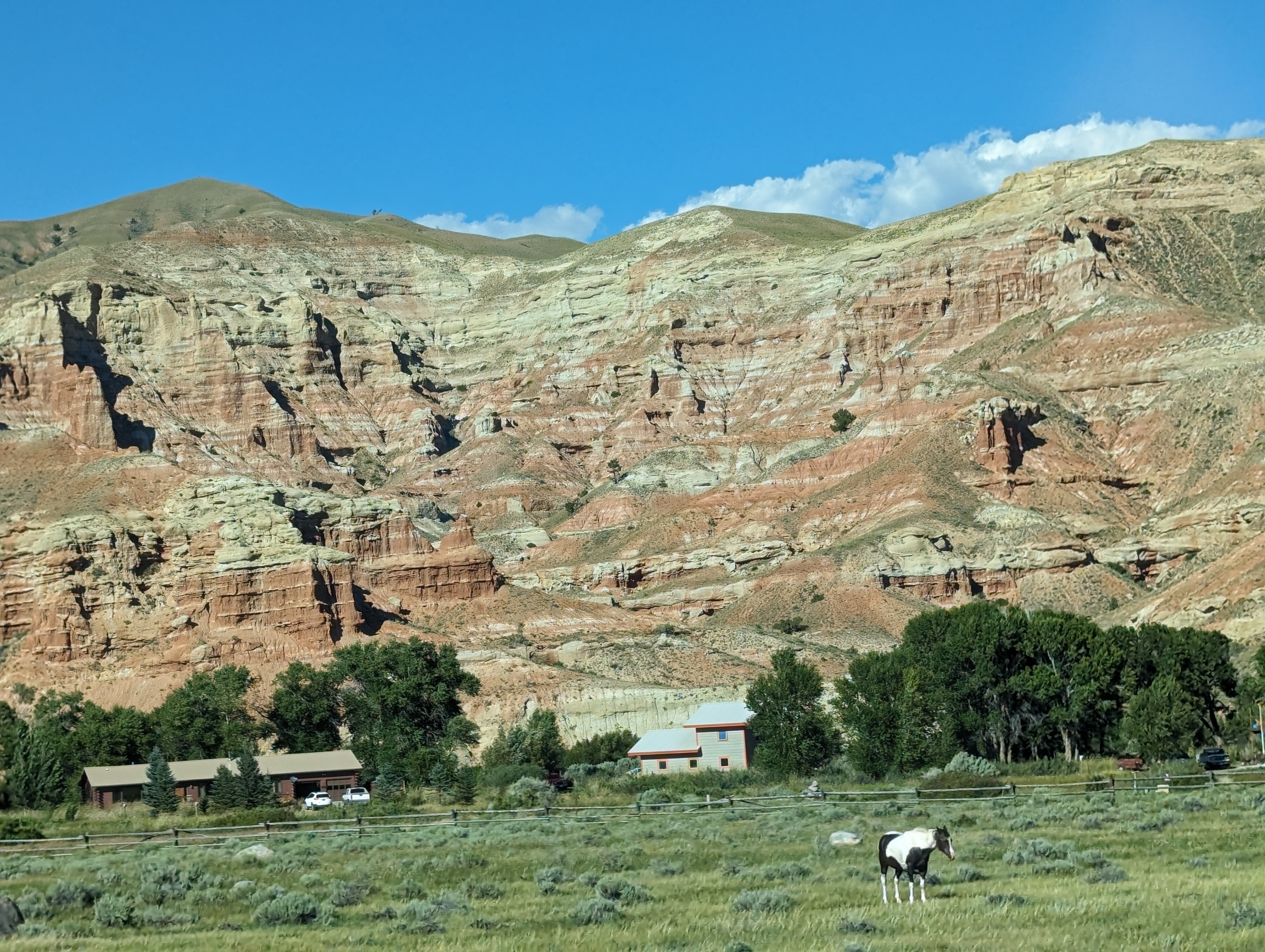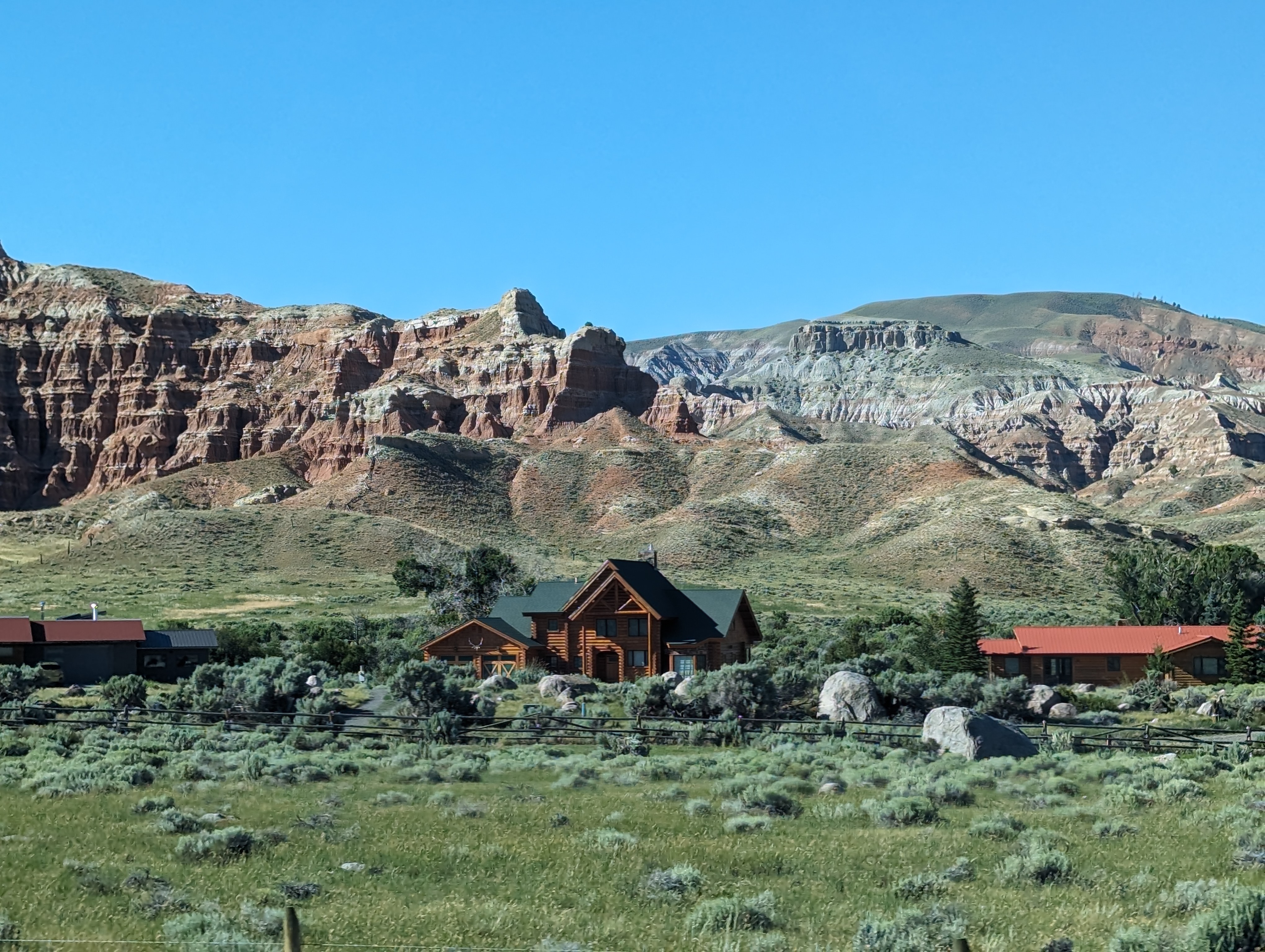 We continued our drive through more beautiful scenery. We could begin to see what we assumed were the Teton ranges in the distance. We passed by the National Museum of Military Vehicles, which seemed to be in the middle of nowhere. It would have been a neat stop if only we had the time. As it was we had underestimated the drive for the day and was going to be arriving to our campground past 7PM, something we had wanted to avoid after having done it for a couple campgrounds before. Unfortunately this meant we couldn’t really afford to stop in many of these places past Thermopolis. To be honest there wasn’t a lot of places to stop, and the temperature was also still quite high. We saw many impressive homes and very unique hills. After more than 2 hours of driving we went through the town of Dubois, and saw a sign at the grocery store that said they sold bear spray so we turned around to get some as we realized we didn’t have any. We thought it might be cheaper than getting it at the park, but it was still $50 US for a can. Everyone needed a bathroom break at this point, and we stopped by the National Bighorn Sheep Interpretive centre around the block but it had closed a 5PM (about 40 min prior), you had to pay to enter, and we didn’t really have the time. We got back into the van and continued on.