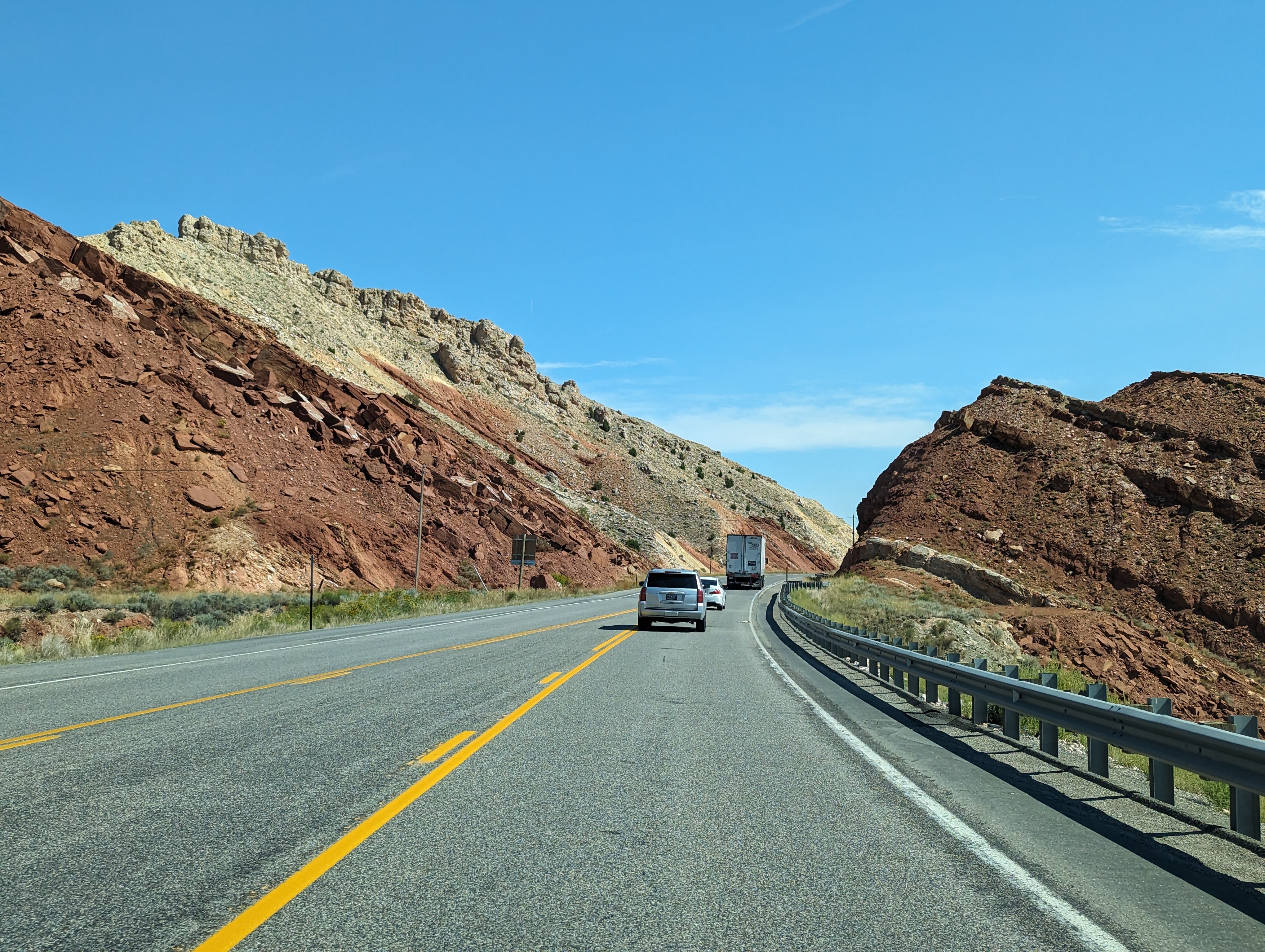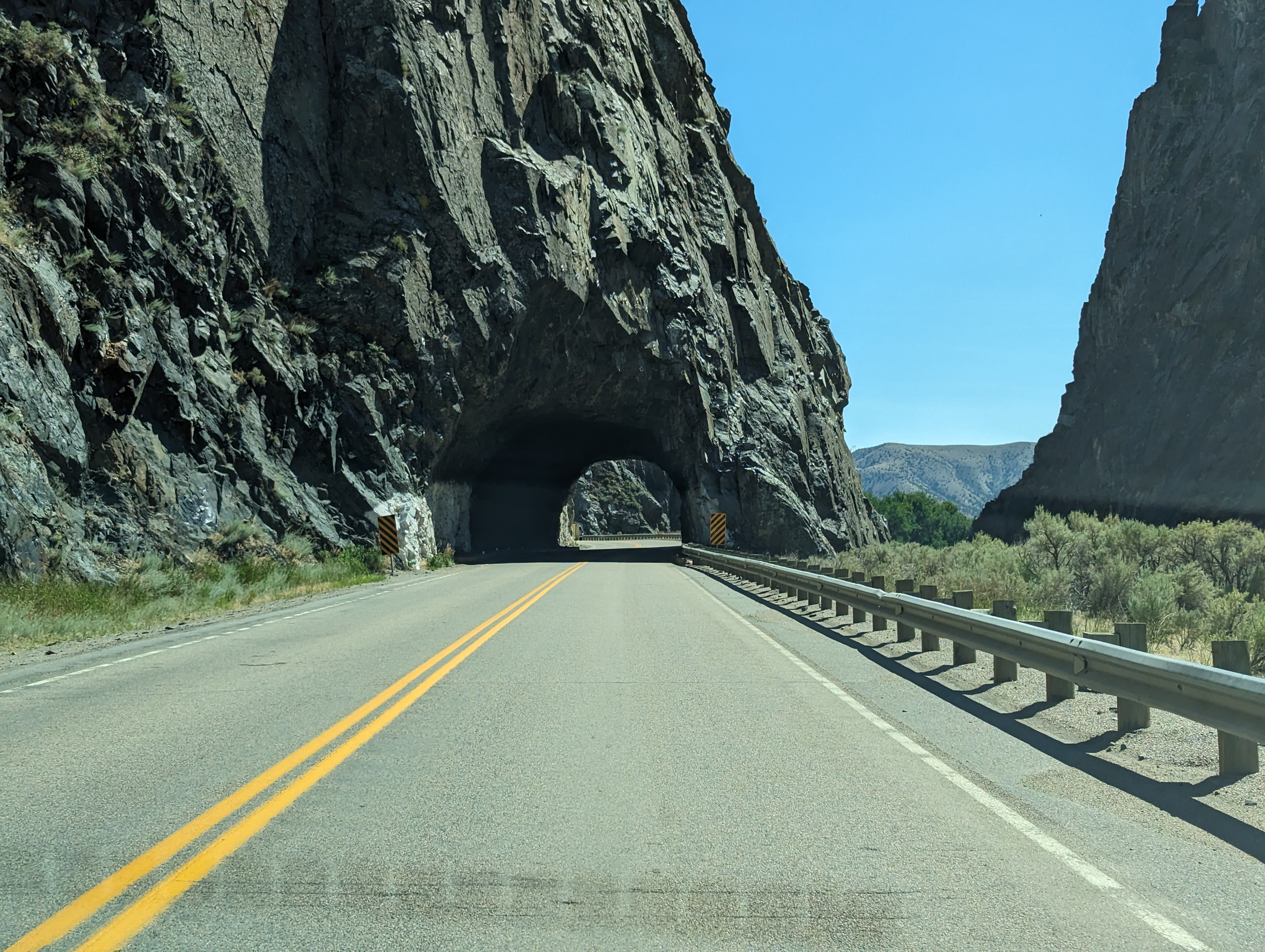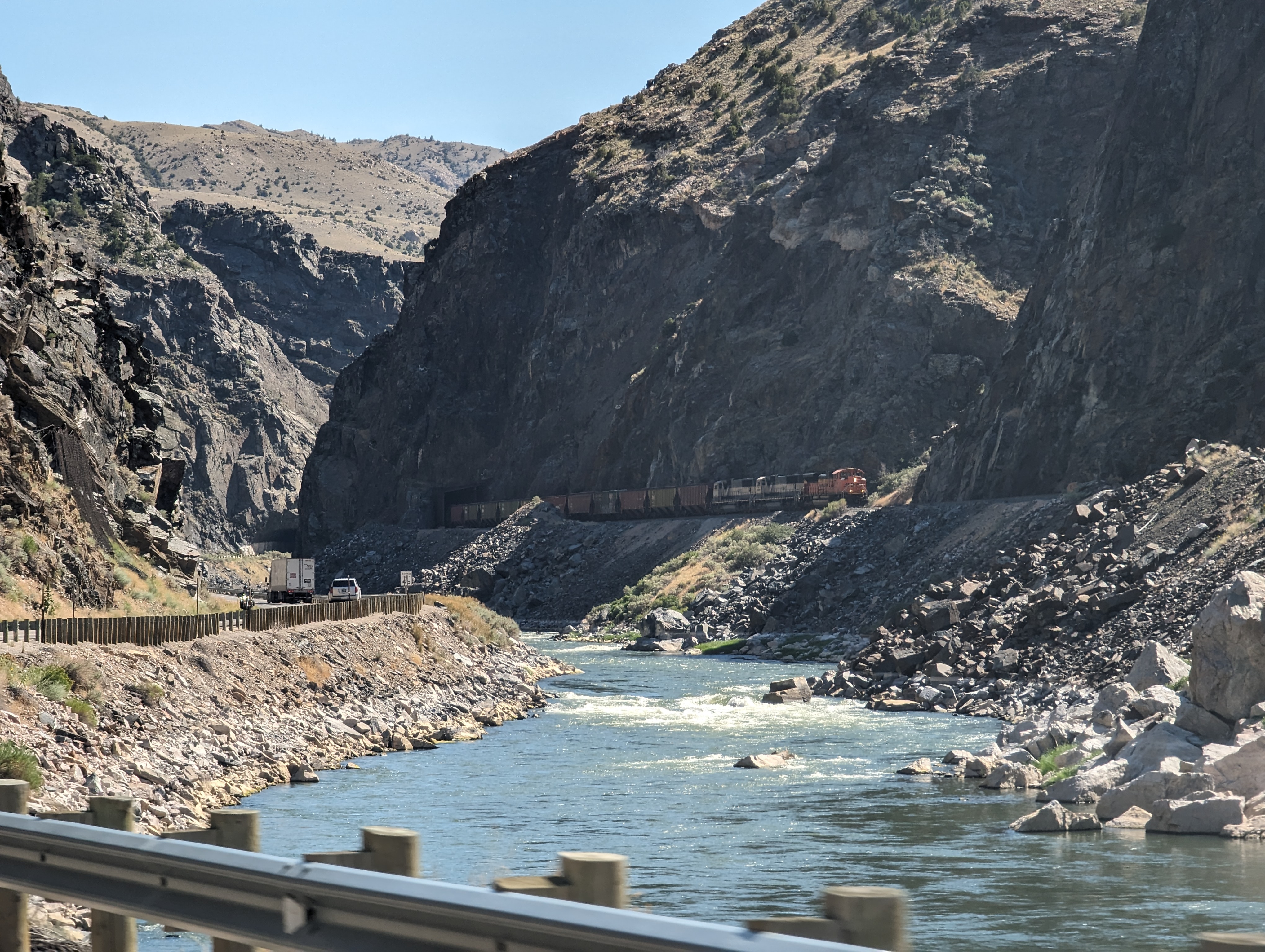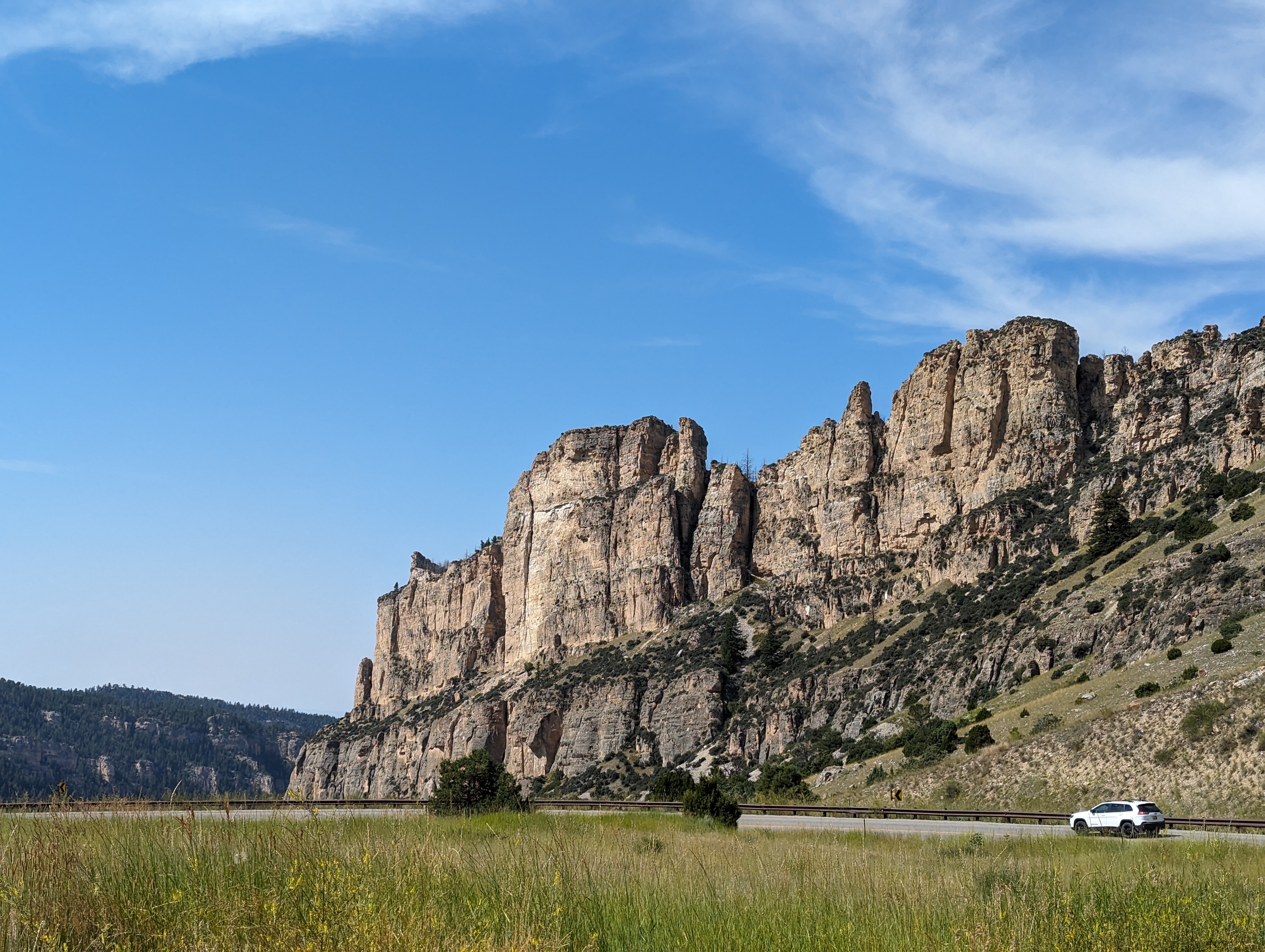 We then continued our drive until we soon reached Wind Canyon, which was absolutely stunning. It was really the very few ways around the mountain range and followed the river that flowed to Thermopolis. The train was on one side of the canyon while the highway was on the other. This was probably one of the most spectacular places I had ever been to. The towering cliffs were so dramatic. We all agreed this was much more impressive than the much talked about needles highway we had just done the day before. It was also a strange illusion as we appeared to be going downhill but the river was flowing the other direction. We then saw a train emerge from a tunnel on the opposite side as we entered multiple short tunnels. After going through the canyon we emerged out into the open plains again and saw the dam that held back all the water prior to the canyon creating the Boysen reservoir. The dam created a huge reservoir, which was a state park. It was much needed water in the desert and was a state park all around it with camp grounds (although at 36 degrees C and little to no shade a lot of these campgrounds looked very very hot. At least there were many beaches along the reservoir. We continued our drive through the dry plains. I couldn’t imagine living in an area so hot and dry with little to no shade anywhere you looked. The scenery however was just so spectacular in all directions. Very different from what we were used to back home!