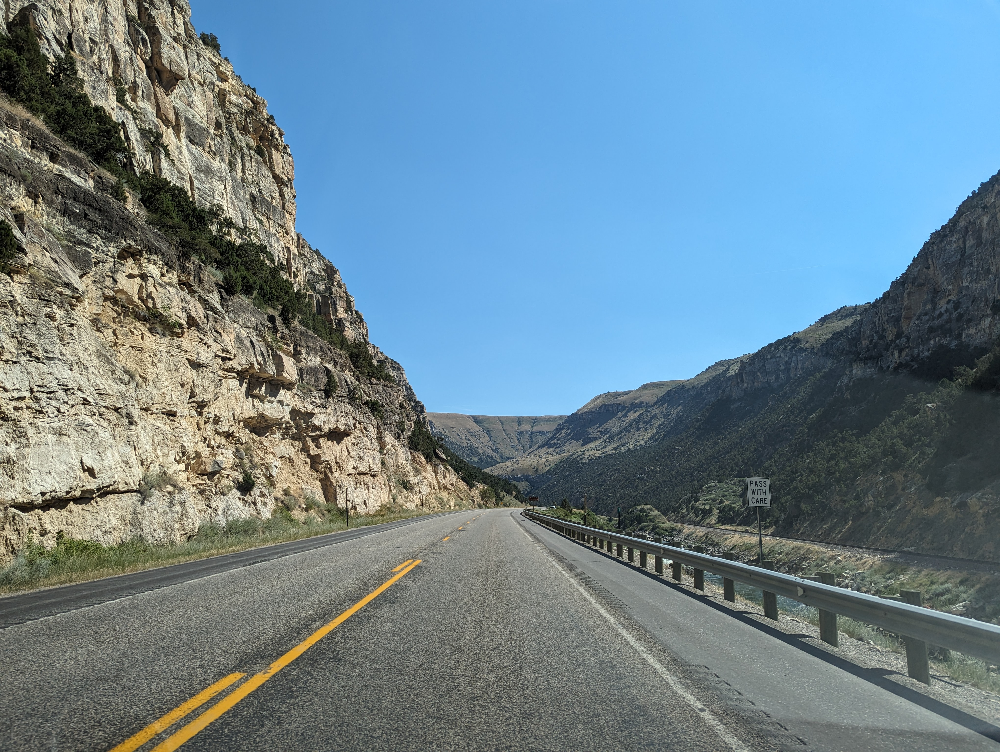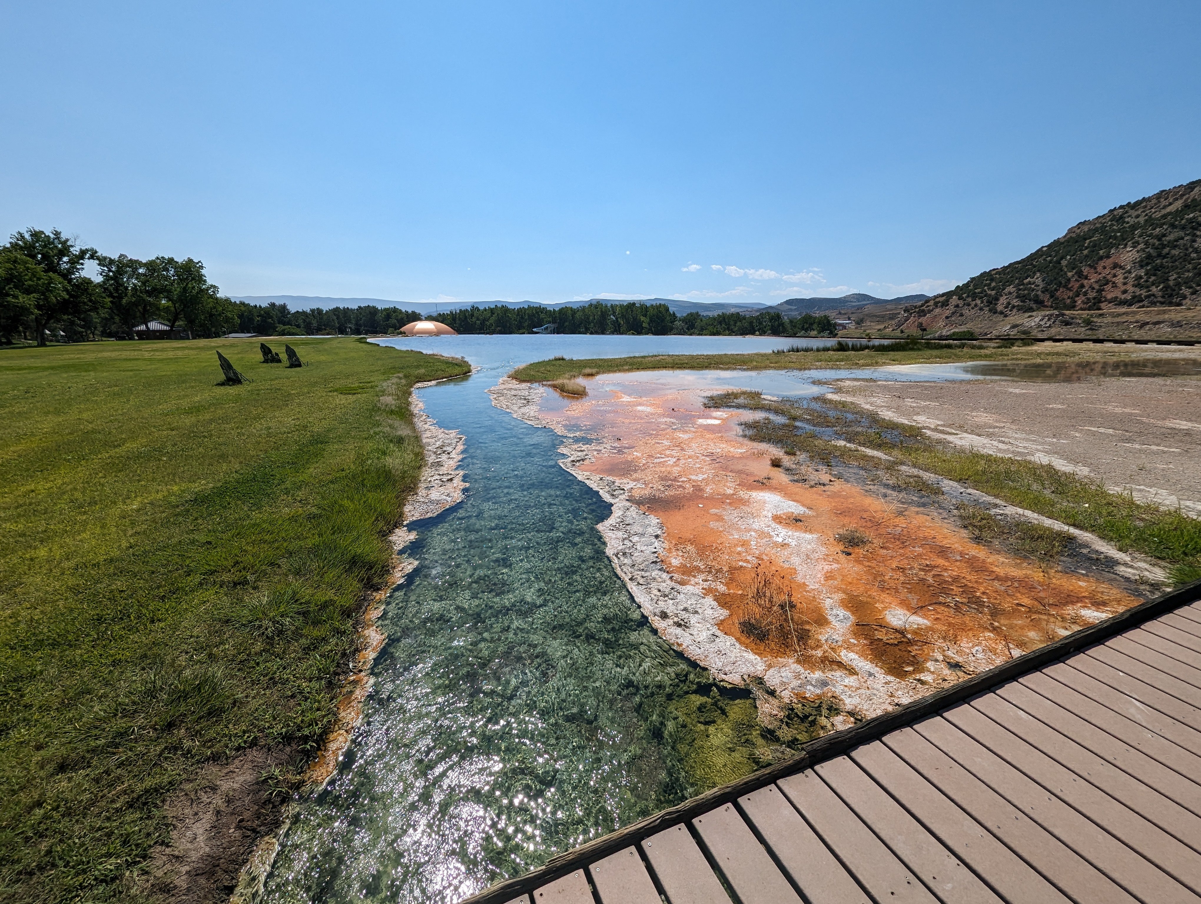 We drove about an hour past the very small community of Winchester into Thermopolis. The temperatures was now close to 36 degrees, the highest we’ve ever seen on our van’s outdoor temperature gauge. Thermopolis was an Oasis in the desert, with greenery, trees, and a lot of shade (which were very rare after leaving Big Horn) and a river running through it. We had planned for a rest stop here and entered the free State Park indoor/outdoor hot spring. After no showers the day before it was just what we needed. The lady at the front desk mentioned that there is a 20 min limit for people entering the pools and that it starts when you get into the pool room (likely to stop people from overheating in the 104 F pools and to control the crowds. Being mid day during the week there were very few people there. After a shower in the change room we entered the pools. The shade in the outdoor pool was much appreciated. We met a local couple who said this was the only State park in Wyoming that was free because when the Natives had sold the land to the Government they stipulated that the hot springs to be freely accessible to the public. They also mentioned that they had 4 months of snow on the ground here, which was hard to believe considering the very arid climate in the summer!